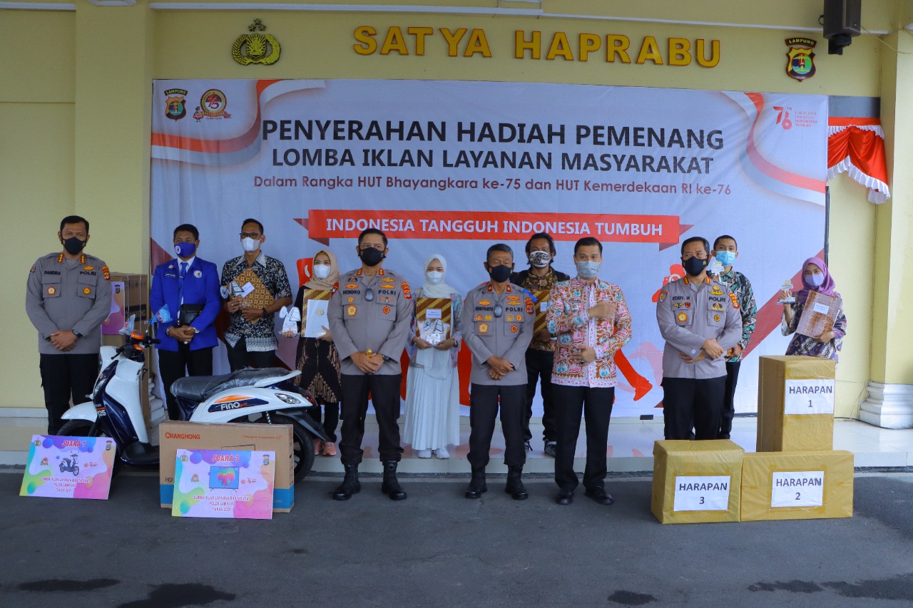 Bandar Lampung, (MDSnews)—Kapolda Lampung Irjen Pol. Hendro Sugiatno serahkan langsung hadiah kepada para pemenang lomba film Iklan Layanan Masyarakat (ILM) dengan tema ‘Indonesia Tangguh Indonesia Tumbuh’ di Mapolda Lampung, pada Kamis (24/9/2021) pagi.