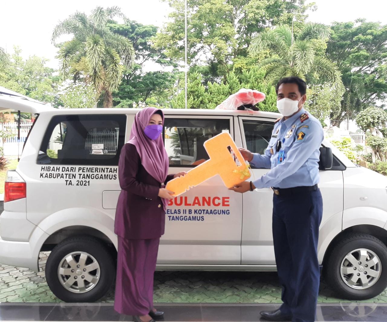 Tanggamus,(MDSnews)-Bupati Tanggamus Hj. Dewi Handajani Secara Simbolis Menghibahkan Mobil Ambulance TA. 2021 Kepada Lapas Kelas II B Kota Agung Tanggamus, di Rumdis Bupati, Senin (27/9/2021).