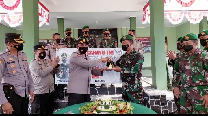 Tanggamus,(MDSnews)-Tingkatkan sinergitas dan soliditas, Polres Tanggamus memberikan surprise dan tumpeng di hari jadinya Tentara Nasional Indonesia (TNI) yang ke 76 di markas Kodim 0424 Tanggamus, Selasa (05/10/2021).