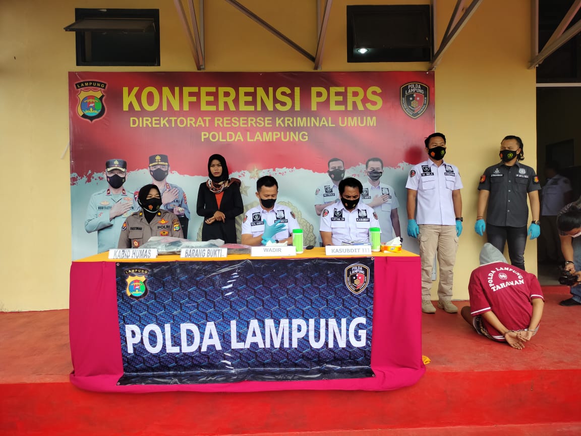 “Tersangka di amankan berdasarkan nomor lamporan Polisi : LP / 620/ VIII / 2021/ LPG / RESTA BALAM / SEK. KDT 30 AGUSTUS 2021,” kata Wadir Krimum, AKBP Rizal Marito SIK SH MSI didampingi Kasubdit 3 AKBP Yustam Dwi Heno dan Penmas Kompol Fauzimah saat Konferensi Pers di Mapolda Lampung Itera.