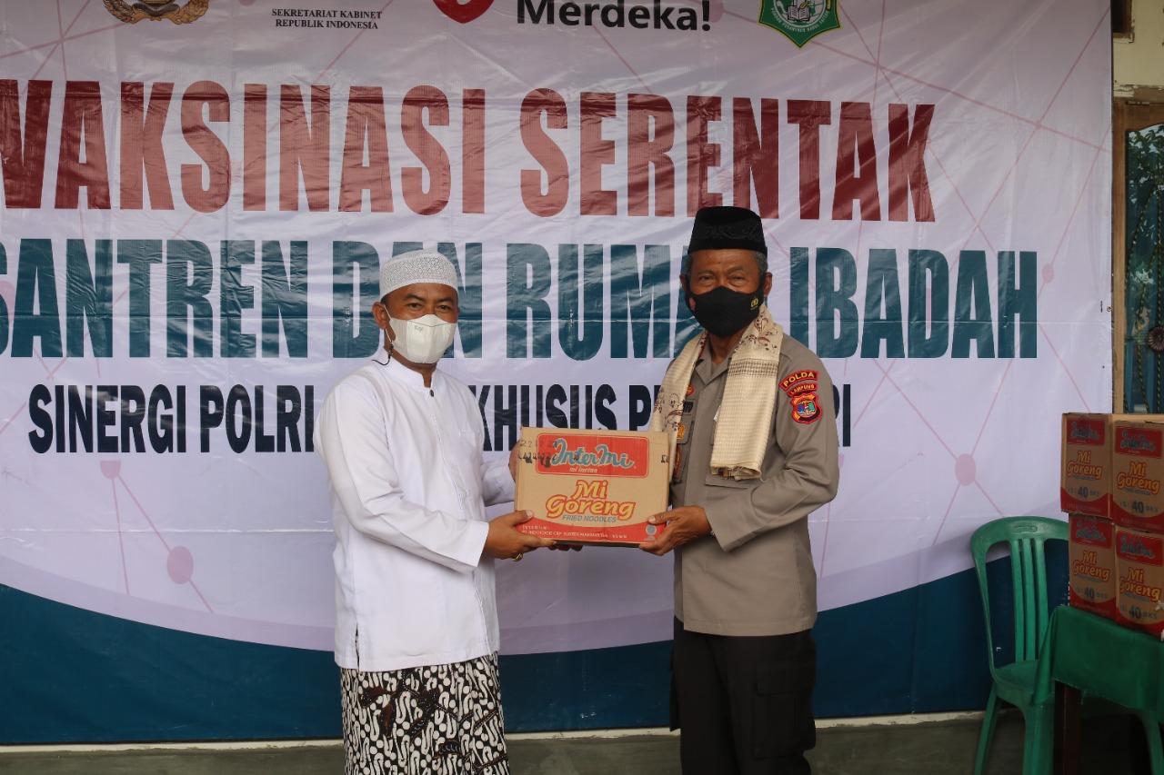 Selain melakukan peninjauan Vaksinasi Massal covid-19, Wakapolda Lampung beserta Rombongan memberikan bantuan sosial berupa paket bantuan bahan makanan kepada kyai Muslih, pengasuh Ponpes Darul Fattah.