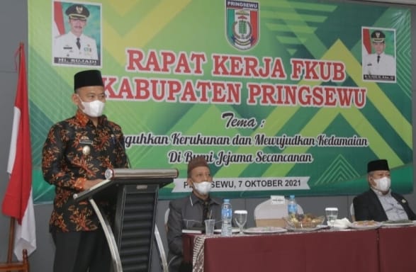 Pringsewu,(MDSnews)-Wakil Bupati Pringsewu Dr. Fauzi membuka rapat kerja FKUB Kabupaten Pringsewu yang bertemakan “Meneguhkan Kerukunan dan Mewujudkan Kedamaian di Bumi Jejama Secancanan”, Bertempat di Hotel Urban Pringsewu, Kamis (07/10/21).