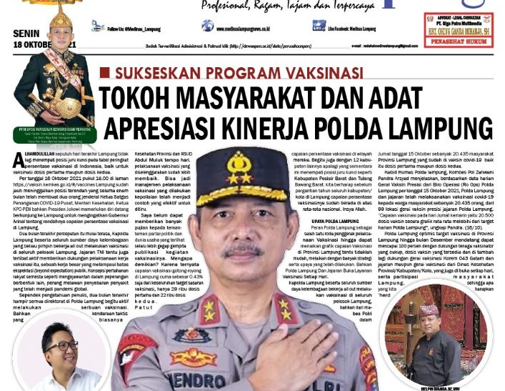 ” Kami Sangat mengapresiasi kinerja jajaran Polda Lampung yang terus berupaya menyukseskan dan jemput bola dalam percepetan Vaksinasi di provinsi Lampung. Serta dapat bertindak tegas dan tak pandang bulu dalam memberikan sanksi kepada pelanggar prokes,” katanya.