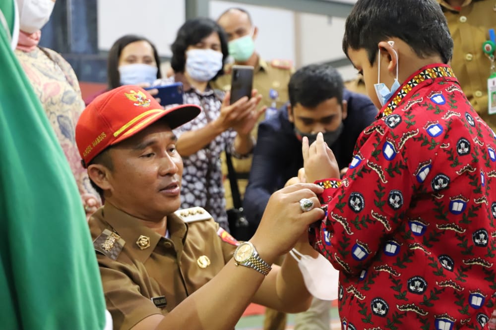 Lampung barat (MDsnews) -implementasi dari pitu program salah satu nya semua bisa melanjutkan sekolah bupati lampung barat dan wakil bupati lampung barat H parosil mabsus, S, Pd dan mad hasnhurin membagikan seragam gratis untuk kecamatan balik bukit tahun ajaran 2021/2022 di Gedung Olah raga (GOR) Aji Saka kawasan sekuting terpadu selasa(19/10/2021).