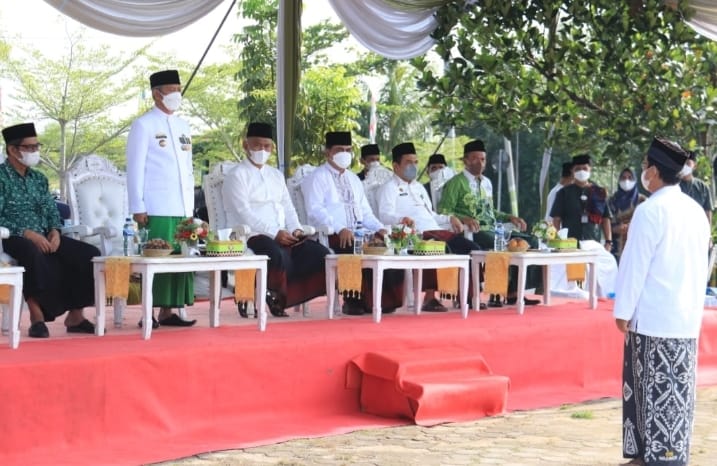 Bupati Pringsewu H.Sujadi dalam hal ini bertindak sebagai pembina upacara yang diikuti oleh perwakilan santri dari berbagai pondok pesantren dan kepala OPD di lingkup Pemkab Pringsewu dengan mengenakan sarung dan berkopiah.