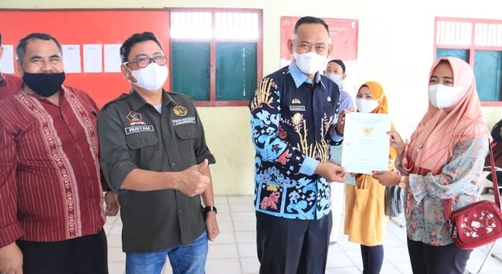 Pringsewu (MDSnews) – Wakil Bupati Pringsewu Dr. Fauzi serahkan sertifikat tanah secara simbolis didampingi Kepala Kantor Pertanahan Kabupaten Pringsewu Rustam kepada perwakilan warga di Balai Pekon Gumukmas. 40 bidang tanah warga Pekon Gumukmas dan 30 bidang tanah warga Pekon Gumukrejo, Kecamatan Pagelaran, Kabupaten Pringsewu, Provinsi Lampung yang dibagikan sertifikatnya.