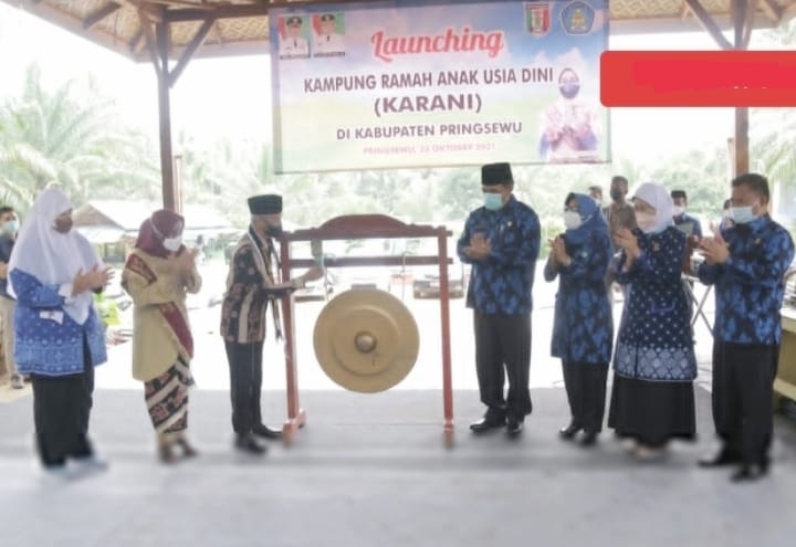 PRINGSEWU (MDSnews) – Kampung Ramah Anak Usia Dini (Karani) Kabupaten Pringsewu secara resmi di-launching yang ditandai dengan prosesi pemukulan gong oleh Bupati Pringsewu H.Sujadi. Acara launching digelar di Taman Wisata Tirta Asri, Pekon Sriwungu, Kecamatan Banyumas, Sabtu (23/10/21).