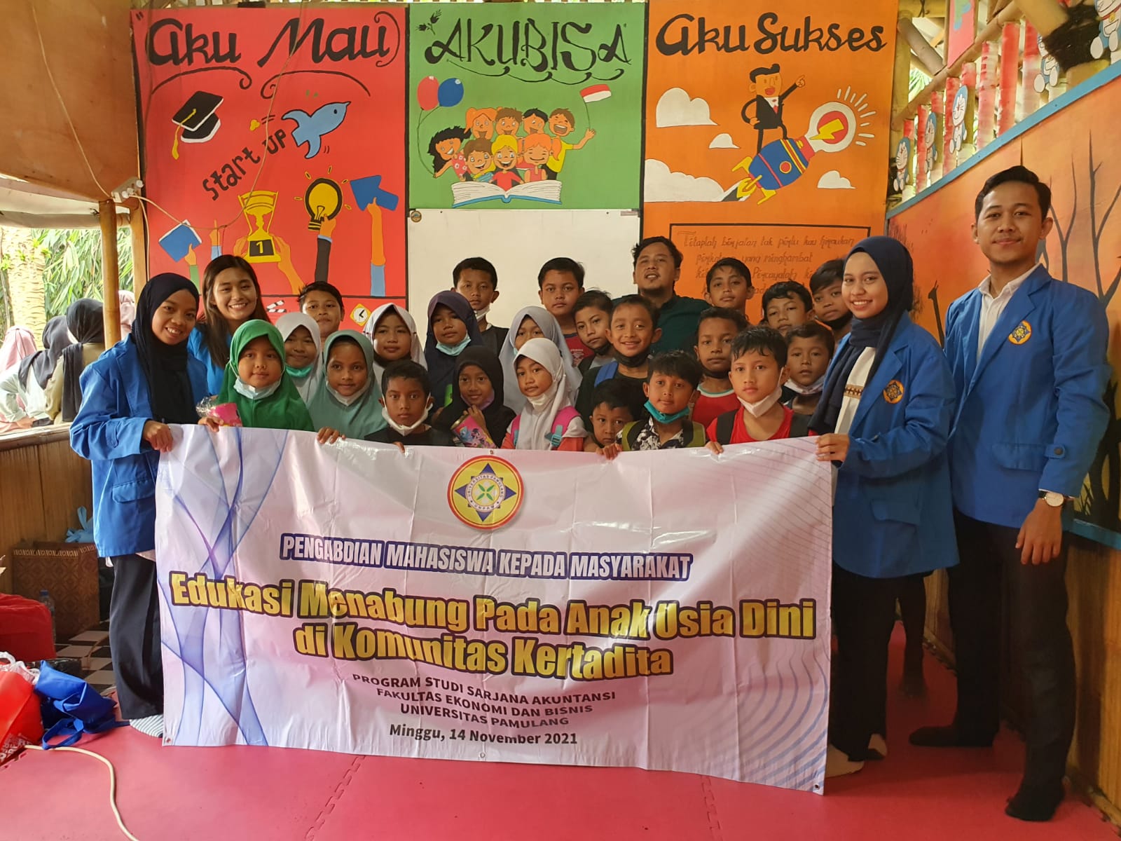 Kegiatan dilaksanakan pada hari minggu, 14 November 2021. Adapun judul dari kegiatan ini yaitu “Edukasi Menabung pada Anak Usia Dini di Komunitas Senja Kertadita”.