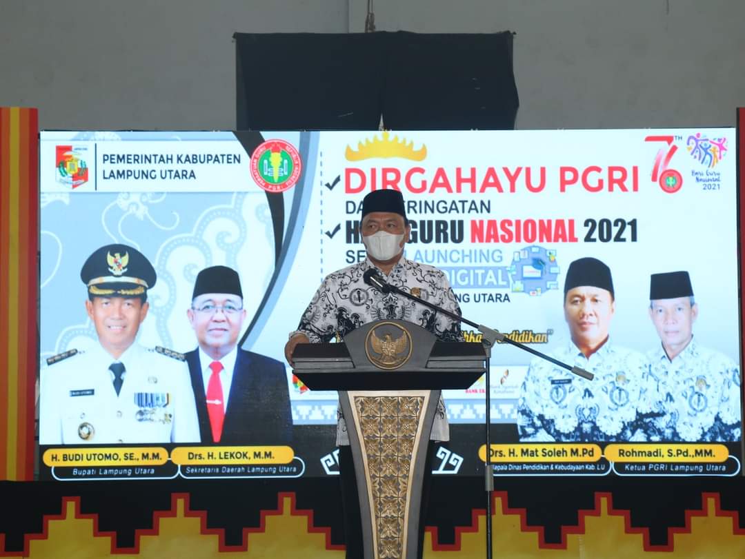 Hal itu dikatakan Bupati Lampung Utara H. Budi Utomo, S.E., M.M., pada Peringatan HUT PGRI ke-76, Peringatan Hari Guru Nasional 2021, dan Launching Sekolah Digital di GOR Sukung Kotabumi, Kamis (25,11/2021).