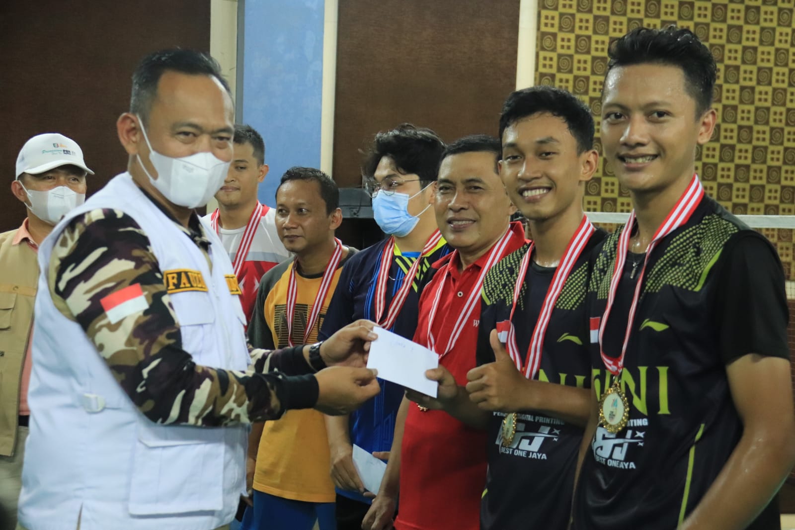 Penyerahan medali dan piala untuk para juara, dilakukan oleh Wakil Bupati Pringsewu Fauzi didampingi KadisporaPar Jahron dan Ketua KONI Pringsewu Dwi Pribadi selepas pertandingan final di Lapangan Bola Voli Tunas Mandiri Sukoharjo III, Kecamatan Sukoharjo, Ahad (12/12/21) malam.