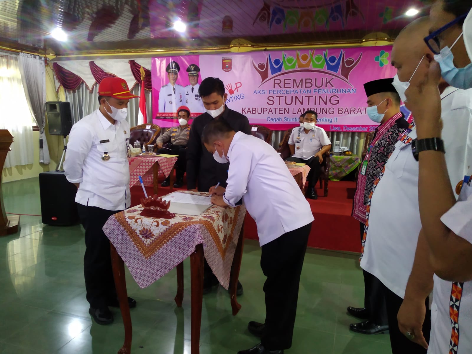 Pembukaan resmi Rembuk Aksi Percepatan Penurunan Stunting Kabupaten Lambar itu ditandai dengan penandatanganan Komitmen bersama yang dilakukan langsung oleh Bupati Lambar Hi. Parosil Mabsus, Kepala Dinas Pemberdayaan Masyarakat dan Pekon Ir. Noviardi Kuswan, Camat Batu Brak Mat Suhyar, Kepala UPT Puskesmas Sumber Jaya Subianto, S.Kep dan Peratin Tri Budi Syukur E. Suharma.