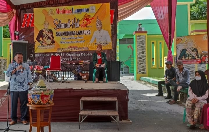 Kegiata HUT Ke-07 SKH Medinas Lampung, jajaran redaksi Medinas Lampung, membagikan bantuan sosial berupa sembako sebanyak 300 paket sembako kepada anak yatim piatu, kaum dhuafa dan masyarakat pra sejahtera di halaman kantor Redaksi Medinas Lampung Bukit Kemiling permai.