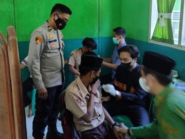 TANGGAMUS (MDSnews)-Ratusan murid MA Pesantren Modern Nahdlatul Ulama (Pemnu) Talang Padang mengikuti pelaksanaan vaksinasi dosis pertama dan kedua yang digelar Polres Tanggamus bersama vaksinator Dinas Kesehatan (Dinkes) Tanggamus.