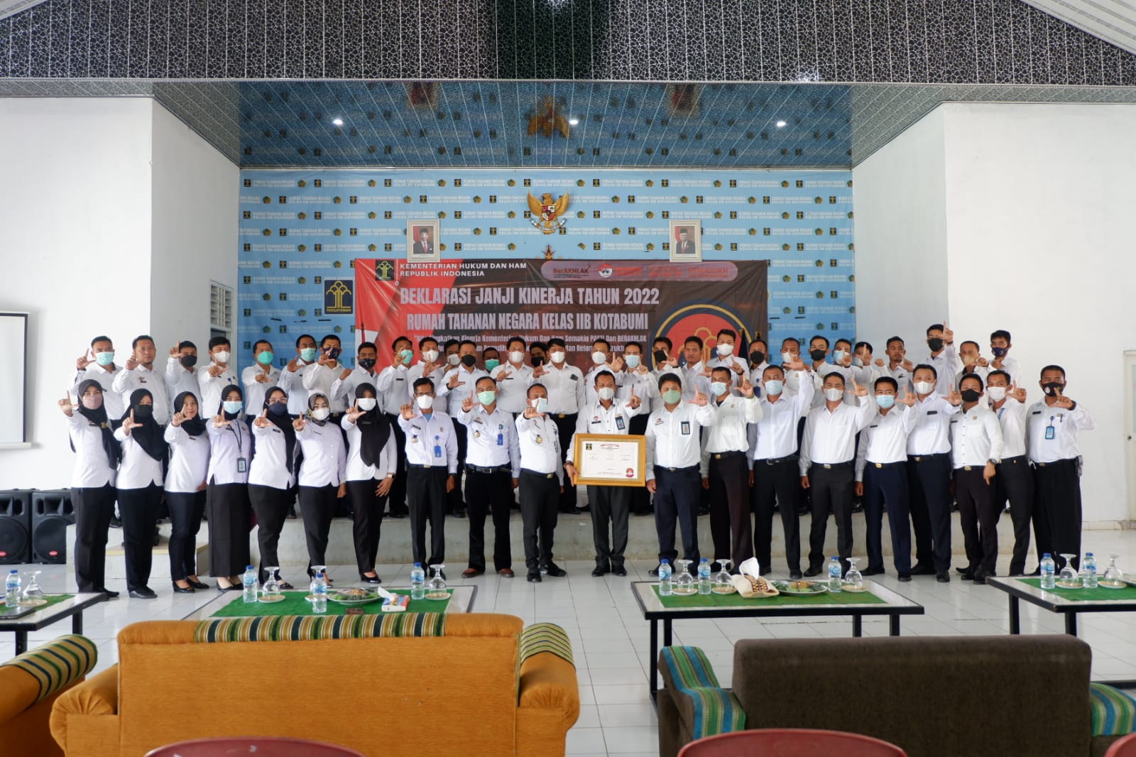 Kegiatan Deklarasi Janji Kinerja Tahun 2022 disaksikan oleh Kepala Divisi Keimigrasian Kemenkumham Lampung (Is Edy Eko Putranto), diikuti oleh Kepala Rumah Tahanan Negara Kelas IIB Kotabumi Mukhlisin Fardi, Kepala Pengamanan Rutan Ade Candra Irawan, Kasubsi Pelayanan Tahanan (Sabar Anju Padang) serta Kasubsi Pengelolaan (Jayeng Supriyanto) dan seluruh pegawai Rumah Tahanan Negara Kelas IIB Kotabumi dilaksanakan di aula Rutan Kotabumi, Selasa (25,01/2022).