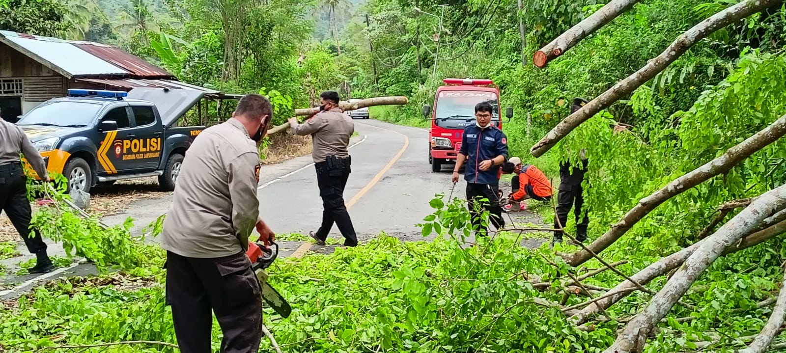 Diakibatkan tiupan angin kencang mengakibatkan pohon di pinggir jalan 9 Kilometer lintas Liwa – Krui tumbang dan menutupi jalan, kasat beserta personil Samapta bersama BPBD langsung menuju lokasi tersebut.
