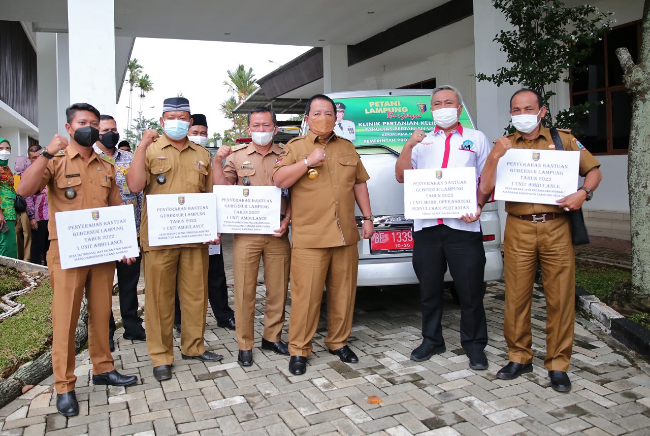 BANDARLAMPUNG (MDSnews) — Gubernur Lampung Arinal Djunaidi menyerahkan bantuan 6 mobil ambulans untuk kepala desa dan 1 mobil operasional penyuluh pertanian kepada Fakultas Pertanian Unila, di Mahan Agung Gubernur, Selasa pagi (8/2/22).