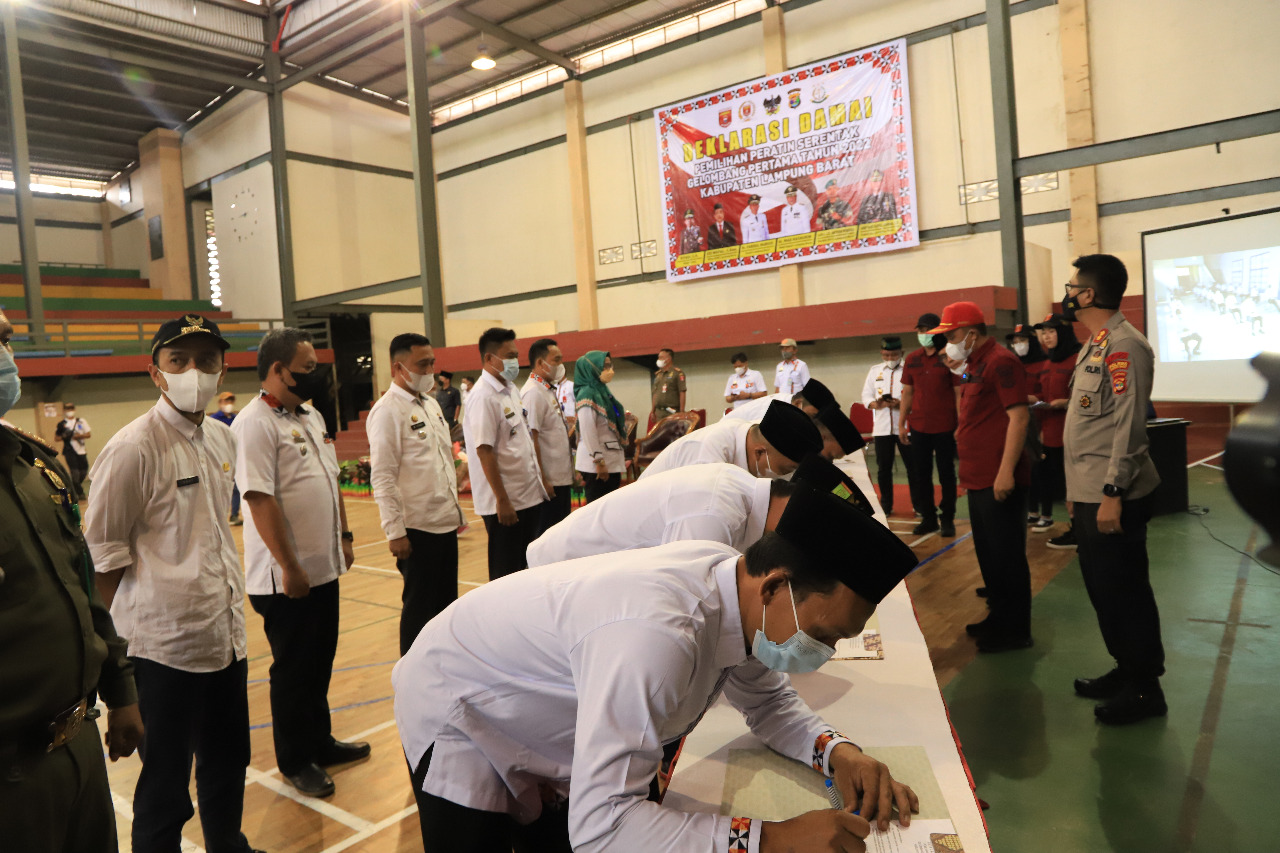 LAMPUNGBARAT (MDSnews)- Deklarasi damai pemilihan peratin gelombang pertama di kabupaten Lampung Barat di laksanakan di Gedung Olah Raga (GOR) Aji Saka, Kawasan Sekuting Terpadu Pekon Wates, Kecamatan Balik Bukit. Rabu (9/2/22).