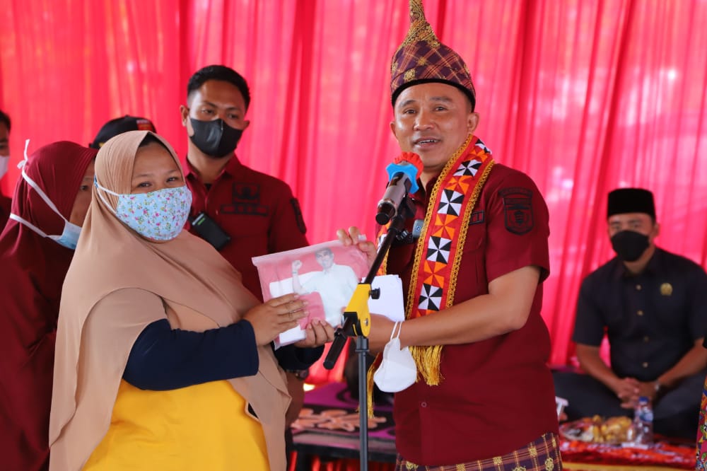 Penyerahan bantuan alat perkebunan dan bantuan bibit tanaman buah serta penyerahan sertifikat hak atas tanah untuk masyarakat di Kecamatan Balik Bukit dan penyerahan bibit benih ikan.