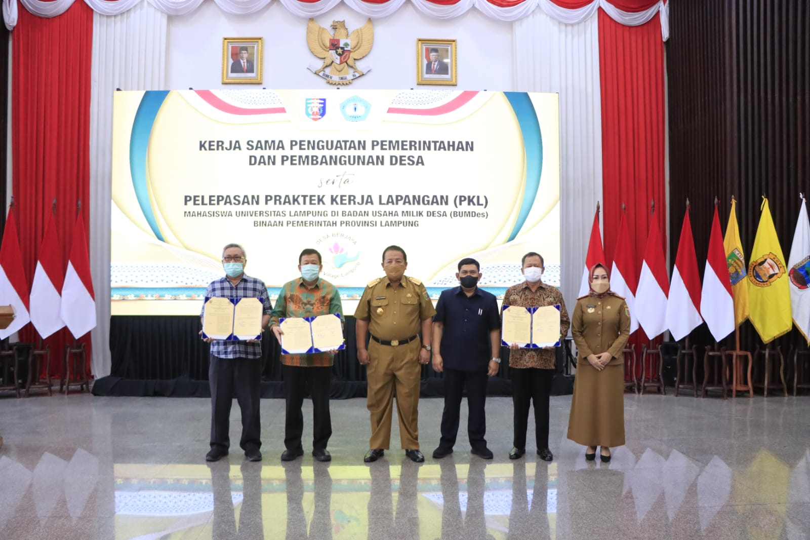 Bandarlampung (MDSnews) – Gubernur Lampung Arinal Djunaidi lakukan penandatanganan kerja sama penguatan pemerintahan dan pembangunan desa dengan Universitas Lampung dan Badan Usaha Milik Desa (BUMDes), serta lakukan Pelepasan Praktek Kerja Lapangan (PKL) Mahasiswa Universitas Lampung di Badan Usaha Milik Desa (BUMDes) Binaan Pemerintah Provinsi Lampung, di Mahan Agung, Selasa (15/02).