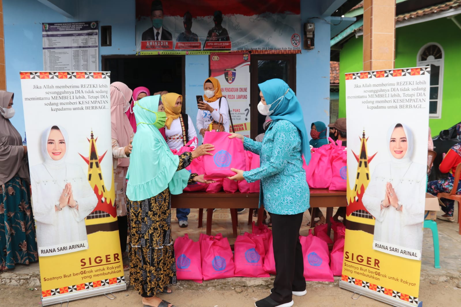 Bantuan juga diserahkan kepada masyarakat di sekitar daerah desa Gebang. Sekretaris TP. PKK Fitrianita Damhuri didampingi sejumlah Pengurus TP. PKK Provinsi Lampung turun langsung di sepanjang jalan untuk menyalurkan bantuan kegiatan SIGER dan berdialog dengan masyarakat penerima bantuan. (Dinas Kominfotik Provinsi Lampung)