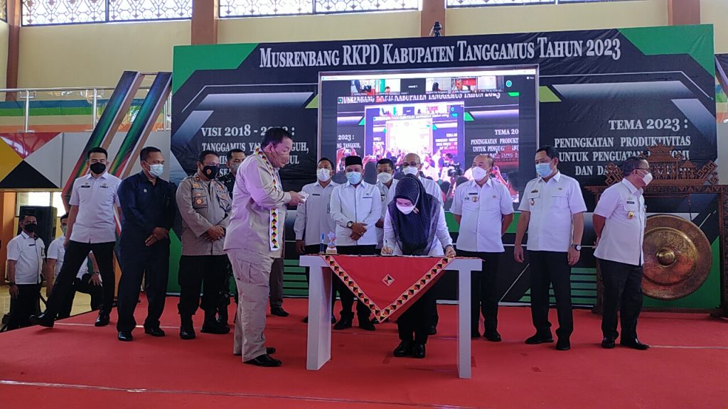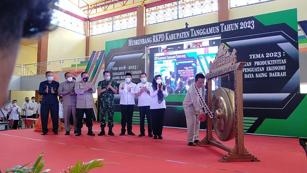 ” Dalam rangka pembangunan tahun 2023 yang akan datang, Kabupaten Tanggamus telah mengidentifikasi isu strategis yang perlu segera dibenahi, salah satunya adalah terkait penguatan ekonomi akibat dampak Covid-19. Awal tahun 2020 ditandai dengan merebaknya pandemi Covid-19, yang mengakibatkan perekonomian dunia terkontraksi termasuk Kabupaten Tanggamus minus 1,77%, akan tetapi pada tahun 2021 mengalami perbaikan dengan berhasil tumbuh positif 2,3%, meskipun masih dibawah Provinsi Lampung yang tumbuh 2,79% dan Nasional 3,69%, oleh karena itu penguatan ekonomi terutama sektor UMKM dan sektor informal lainnya akan menjadi perhatian khusus, guna mendorong daya beli masyarakat, termasuk menjaga stabilitas harga dan ketersediaan bahan pokok, sehingga target pertumbuhan ekonomi sebesar 4% dapat dicapai pada tahun 2023,”Ucap Bupati Tanggamus.