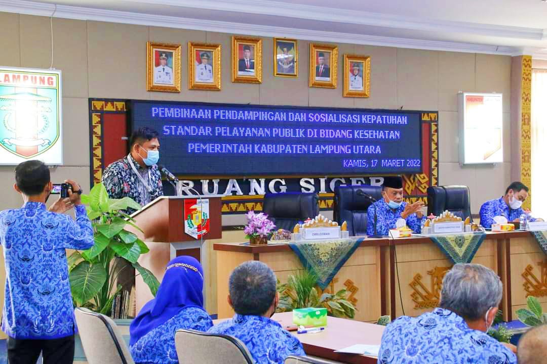LAMPUNG UTARA (MDSnews) – Pembukaan acara Standar Pelayanan Publik pada bidang jasa kesehatan, di ruang Siger Pemkab Lampung Utara kegiatan dibuka oleh. Bupati Lampung Utara, Diwakili Asisten III bidang Administrasi Umum, H. Sofyan, S.P., M.M. Kamis (17/03/2022).