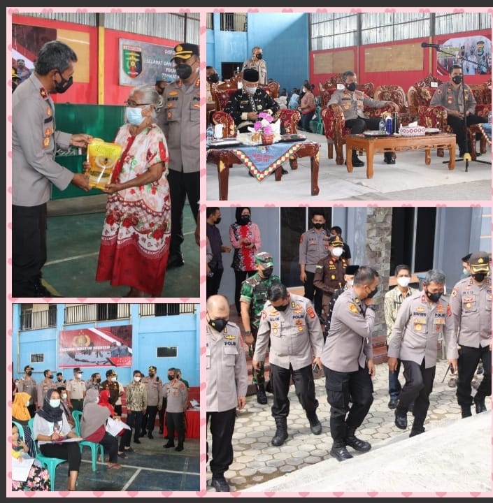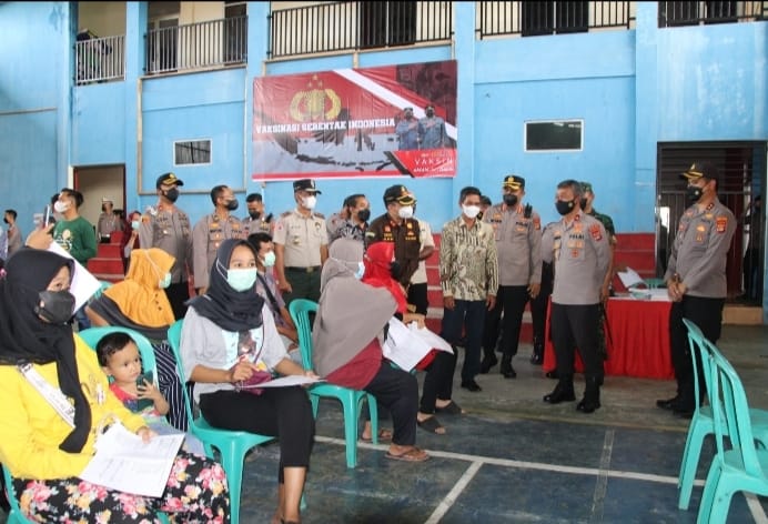 PRINGSEWU (MDSnews) – Wakapolda Lampung Brigjen Polisi Subiyanto meninjau kegiatan vaksinasi masal di Kabupaten Pringsewu. Vaksinasi masal dengan protokol kesehatan yang diselenggarakan Kepolisian Resor Pringsewu bekerjasama dengan Dinas Kesehatan dan sejumlah RS, di Pringsewu ini yang merupakan bagian dari Vaksinasi Nasional Serentak di Polda dan Polres seluruh Indonesia Vaksinasi Doorprize, di gelar di GOR Bumi Jejama Secancanan, Kuncup, Pringsewu Barat, Kabupaten Pringsewu, Jum’at (18/3/22).