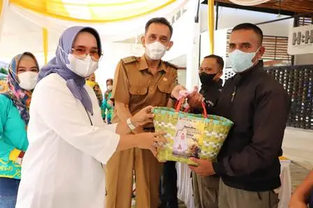 BANDAR LAMPUNG (MDSnews) — Ketua TP. PKK Provinsi Lampung, Riana Sari Arinal, didampingi Sekretaris Dekranasda Provinsi Lampung, Rusdiana Dewi melaksanakan kegiatan Beli dan Bagi, di halaman Kantor Dekranasda Provinsi Lampung, Senin (25/04/2022).