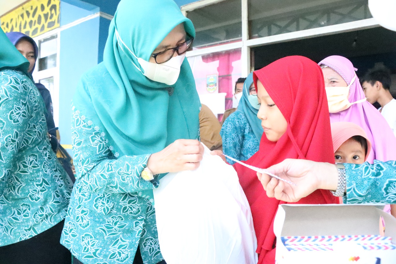 Ketua umum TP PKK Kabupaten pesisir barat Septi Istiqlal, menyerahkan bantuan santunan dan sembako anak yatim. Santunan dan sembako diberikan kepada 300 anak yatim di Aula Kantor Kecamatan Lemong dan Sekretariat PKk, Senin (25/4/22).