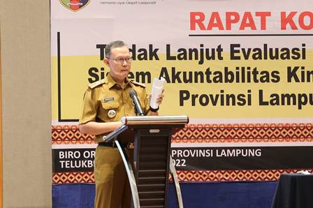 BANDAR LAMPUNG (MDSnews) — Gubernur Lampung Arinal Djunaidi, diwakili Sekretaris Daerah Provinsi Lampung Fahrizal Darminto, membuka Rapat Koordinasi Tindak Lanjut Evaluasi Reformasi Birokrasi (RB) dan Sistem Akuntabilitas Kinerja Instansi Pemeritah (SAKIP) Provinsi Lampung tahun 2022 di Hotel Golden Tulip, Selasa (14/6/2022).