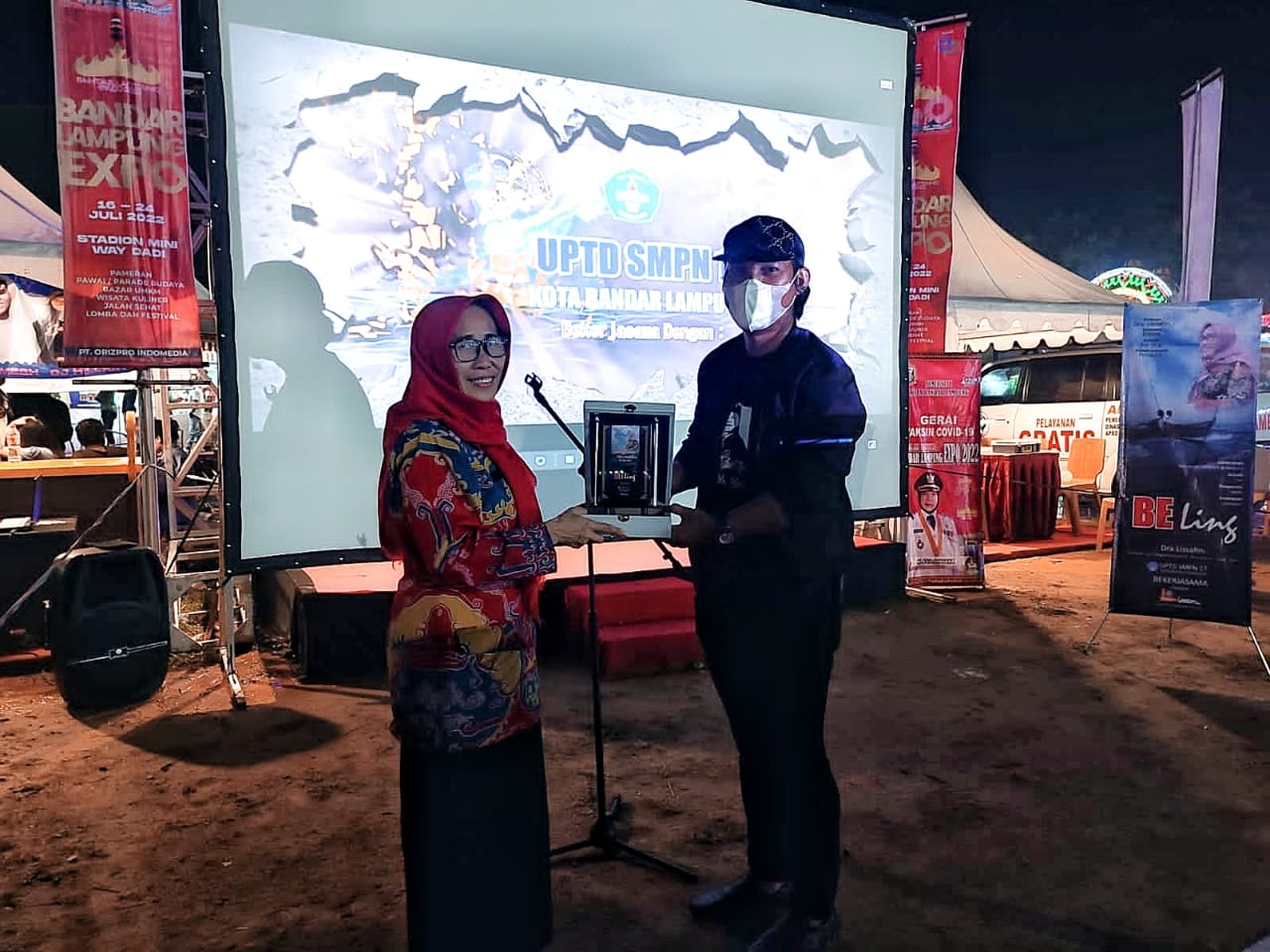 Bandar Lampung (MDSnews) – Ketua KNPI Lampung, Iqbal Ardiansyah (Kanan), menerima cendera mata dari Kepala SMPN 17 Bandar Lampung, Dra. Lissafini, usai pemutaran perdana film BE-ling, di Stadion Mini Way Dadi Bandar Lampung, Rabu (20/7/22).