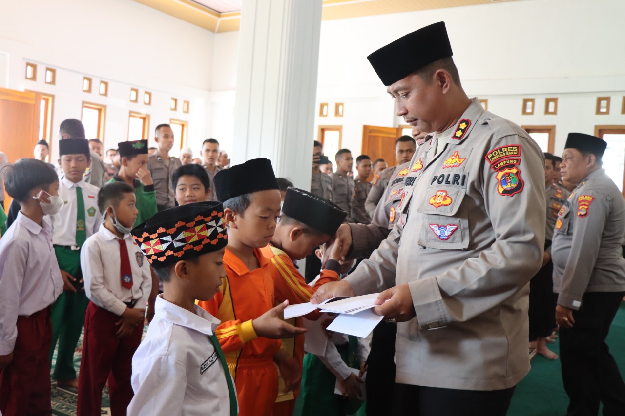 Kemudian sebelum mendengarkan ceramah agama yang di sampaikan oleh Ustad Hi. Samsul Ma’arif, Kapolres Lampung Barat mengundang anak yatim piatu dan memberikan santunan kepada anak yatim piatu yang berjumlah 50 (Lima Puluh) orang anak.