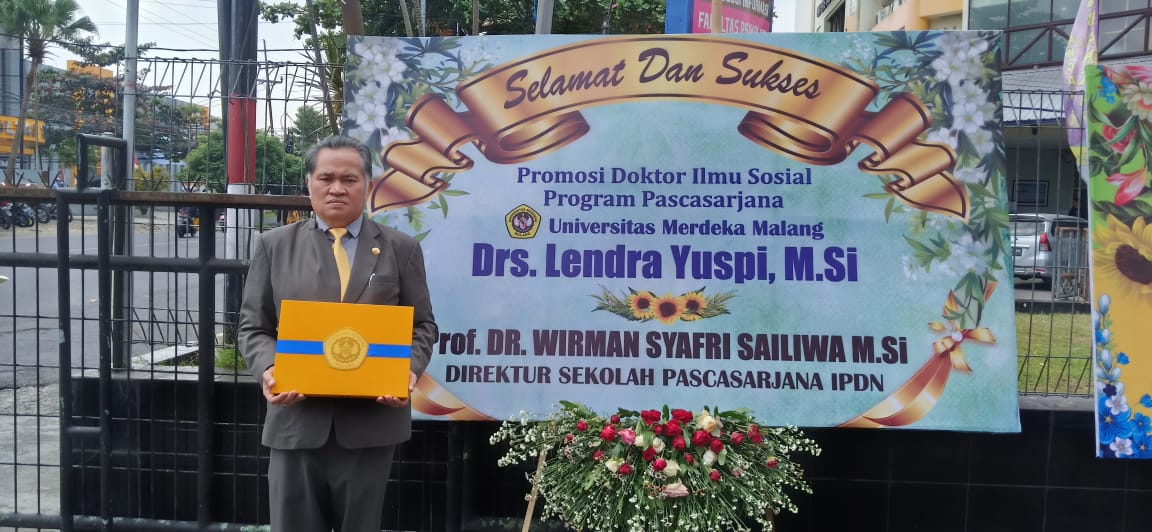 Salah satunya yakni Dr.Drs.H.Lendra yuspi j Geasill,M.Si, yang baru saja lulus Program Doktor Ilmu Sosial Universitas Merdeka Malang (Unmer Malang) dengan IPK 3,97, dan menjadi lulusan terbaik.