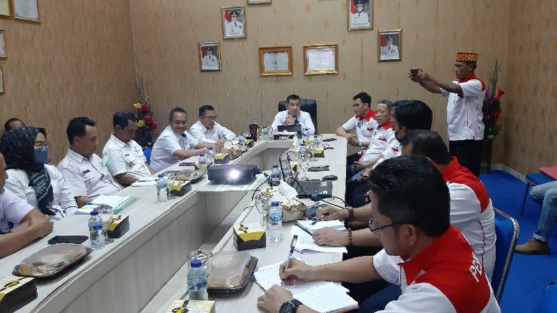 Bupati Pesawaran Dendi Ramadhona menerima kunjungan Komite Olahraga Nasional Indonesia (KONI) Kabupaten Pesawaran guna pemaparan persiapan kontingen Porprov Lampung 2022, Kamis (13/10/22) di ruang rapat Bupati Pemkab Pesawaran.