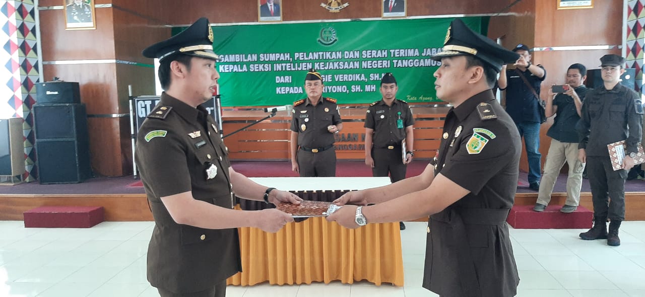 Prosesi pengambilan Sumpah dan Serah Terima Jabatan berlangsung di Aula Kejari Tanggamus yang dipimpin Kepala Kejari Tanggamus Yunardi, Kamis (3/11/22).
