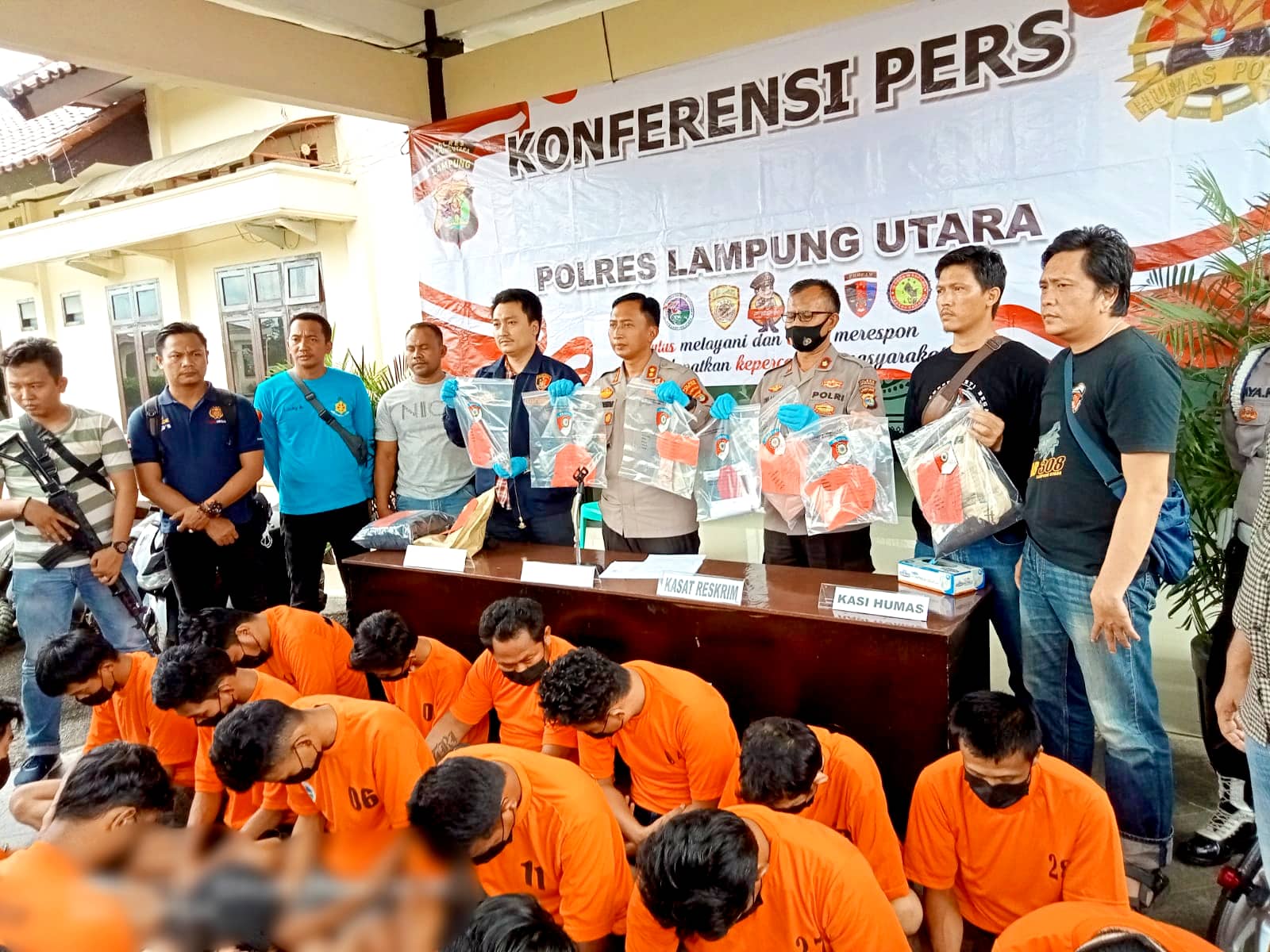 Konferensi pers tersebut dilaksanakan di halaman Mapolres Lampung Utara, dijelaskan oleh Kapolres Lampung Utara AKBP Kurniawan Ismail S.H.,S.I.K., M.I.K, yang didampingi oleh Waka Polres Kompol Dwi Santosa, dan Kasat Reskrim AKP Eko Rendi Oktama, S.H., konferensi pers digelar sesuai dengan hasil kegiatan periode (14 September sampai 10 November 2022) dengan jumlah kasus sebanyak 20 kasus dengan jumlah pelaku sebanyak 22 orang.