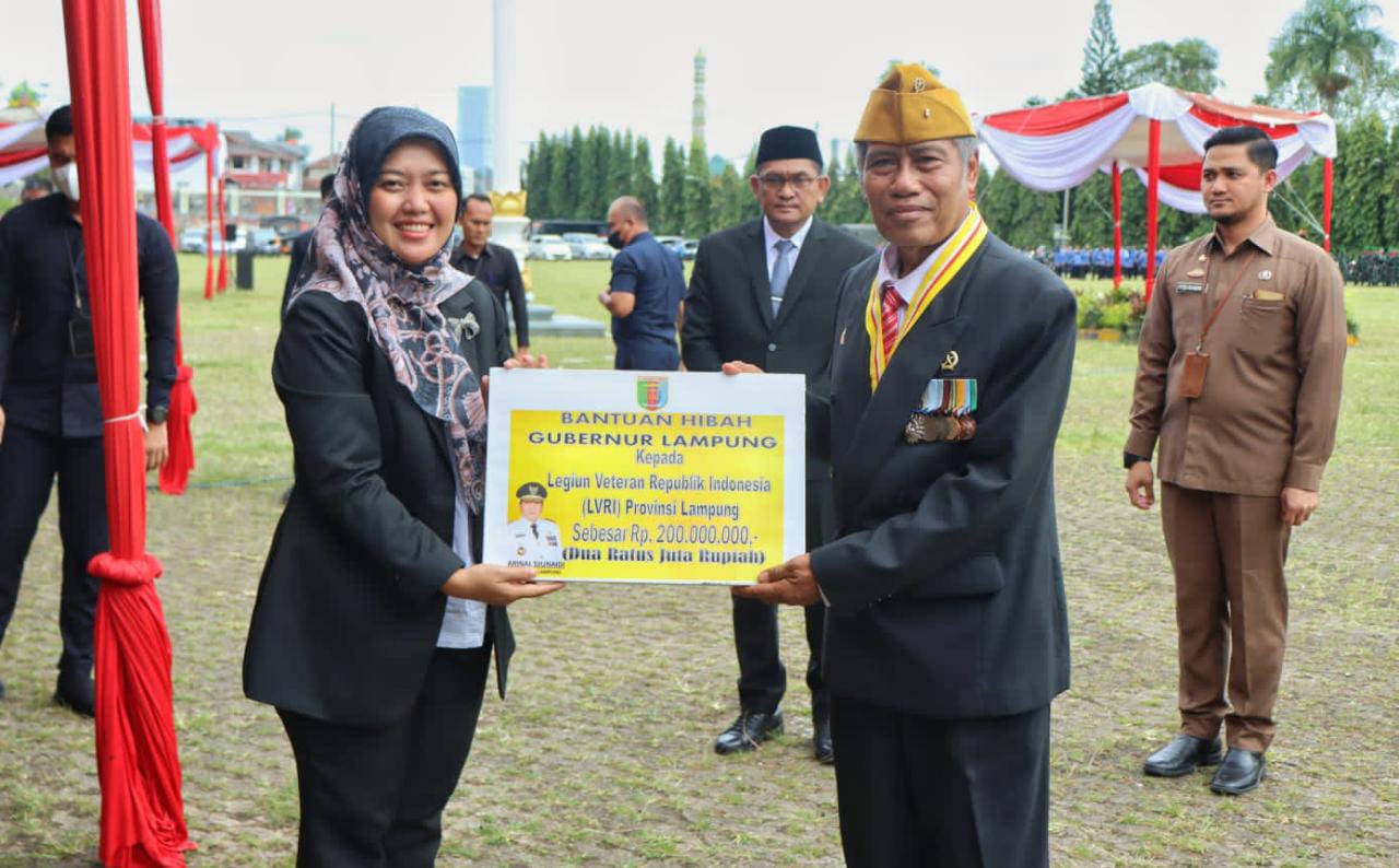 Bandar Lampung (MDSnews) – Kepala Dinas Sosial Provinsi Lampung Drs. Aswarodi, M.Si., mendampingi Wakil Gubernur Lampung Chusnunia Chalim (Nunik) menyerahkan secara simbolis bantuan hibah dari Gubernur Lampung Arinal Djunaidi, kepada Legiun Veteran Republik Indonesia (LVRI) Provinsi Lampung sebesar Rp200 juta yang diterima langsung ketua LVRI Mayor Purn. Subardi.