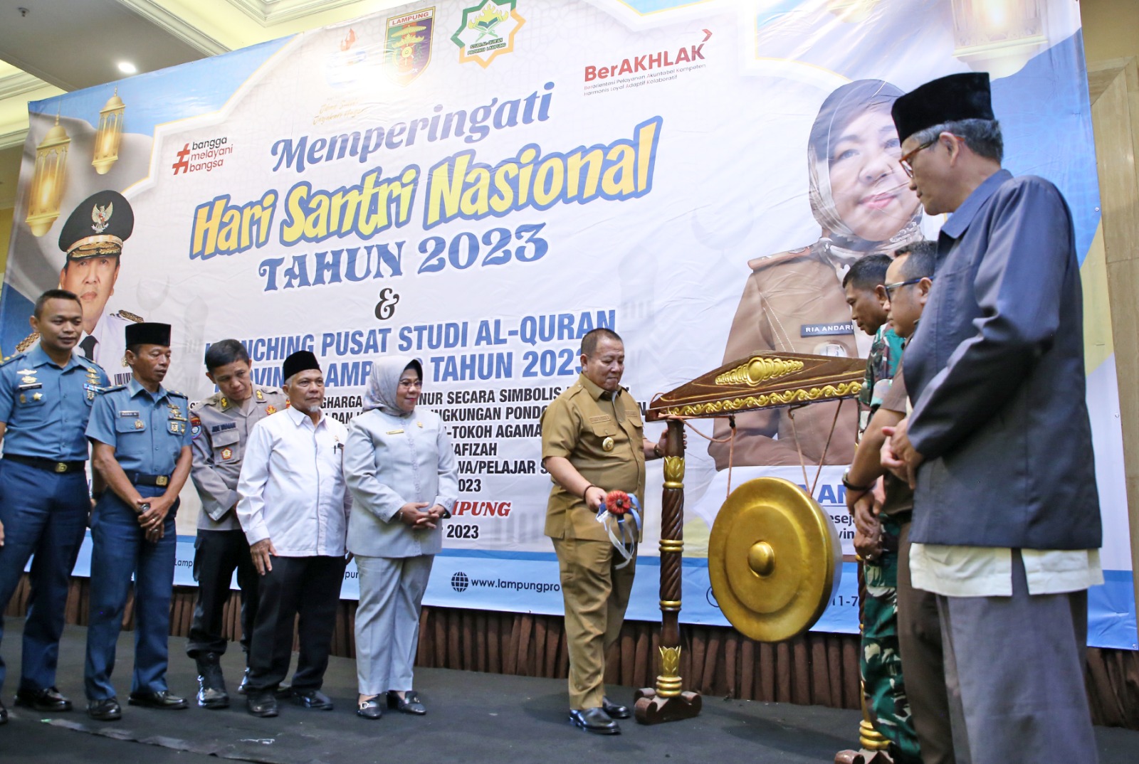 BANDARLAMPUNG – Gubernur Lampung Arinal Djunaidi meluncurkan Pusat Studi Al-Quran Provinsi Lampung bertepatan dengan perayaan Hari Santri Nasional 2023 di Ballroom Swiss-bell Hotel, Bandar Lampung, Senin (23/10/2023).