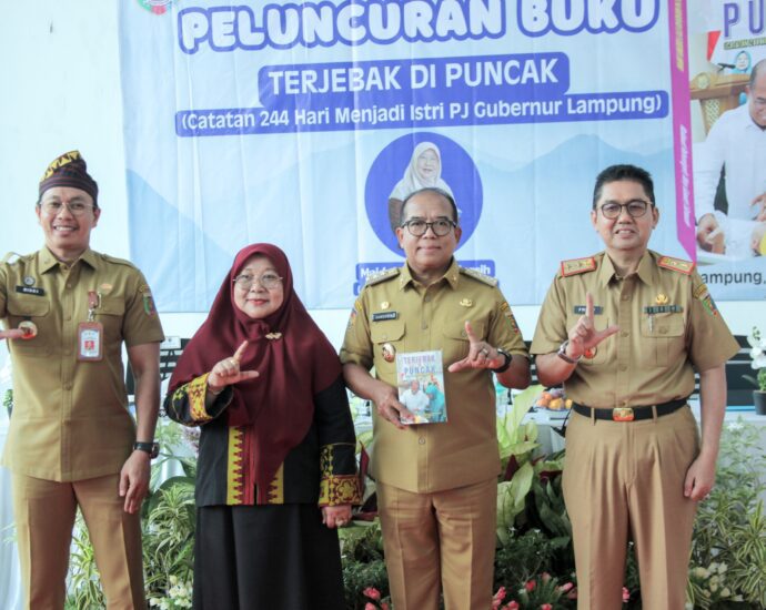 BANDAR LAMPUNG — Penjabat (Pj) Gubernur Lampung, Samsudin, didampingi Pj. Bunda Literasi Provinsi Lampung, Maidawati Retnoningsih menghadiri peluncuran Buku “Terjebak di Puncak”, bertempat di Dinas Perpustakaan dan Kearsipan Provinsi Lampung, Senin (10/2/2025).