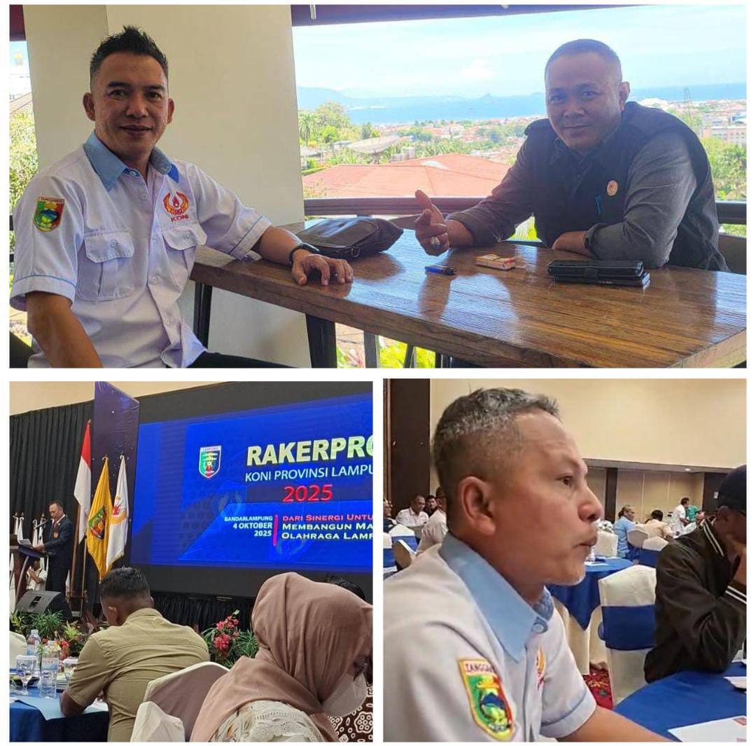Bandar Lampung (Medinas_News) — Sekretaris Umum Komite Olahraga Nasional Indonesia (KONI) Kabupaten Tanggamus, Budi Utomo, S.STP, M.H., didampingi Wakil Ketua II Koni Tanggamus Suharni. S.Sos, dan Kepala Bidang Pembinaan Prestasi (Binpres) KONI Tanggamus, Bayu Mahardika, S.H., menghadiri Rapat Kerja Provinsi (Rakerprov) KONI Provinsi Lampung Tahun 2025. Kegiatan ini berlangsung di Kecamatan Teluk Betung Utara, Bandar Lampung, Sabtu (04/10/2025).