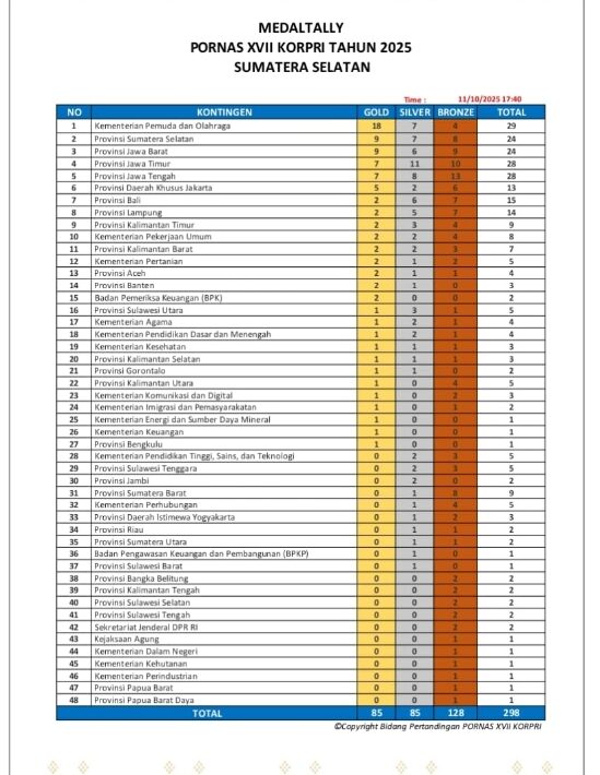 PALEMBANG- Semangat juang dan dedikasi tinggi aparatur sipil negara (ASN) asal Sai Bumi Ruwa Jurai kembali berbuah manis. Kontingen Lampung sukses menorehkan prestasi gemilang dalam Pekan Olahraga Nasional Korpri (Pornas Korpri) XVII Tahun 2025 yang digelar di Palembang, Sabtu (11/10/2025).