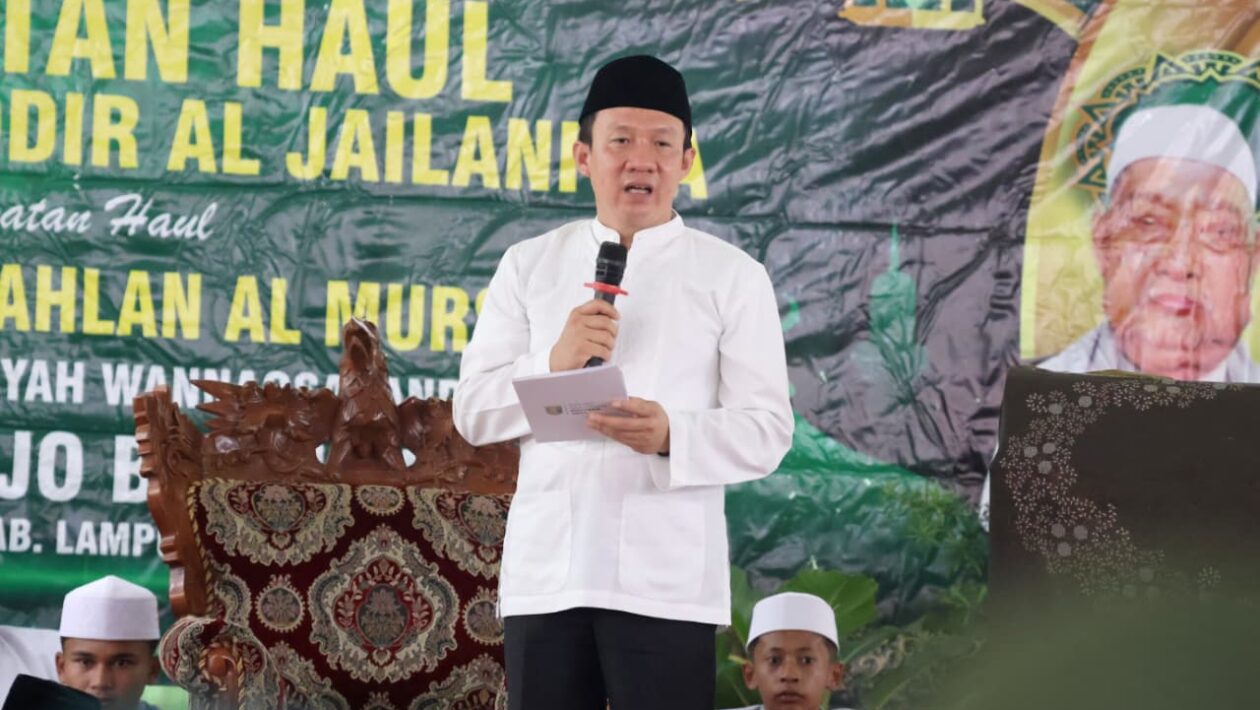 LAMTENG– Gubernur Lampung diwakili Sekretaris Daerah Provinsi Lampung, Marindo Kurniawan, menghadiri Pengajian Haul Syaikh Abdul Qodir Al-Jailani Thoriqoh Qodiriyah Wanaqsabandiyah, di Mushola Baiturrohman, Kampung Rejo Basuki V, Kecamatan Seputih Raman, Minggu (12/10/2025).
