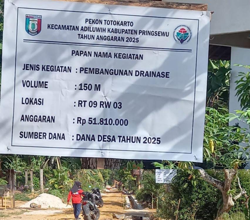 Pringsewu (MDSNews) — Pekon Totokarto, Kecamatan Adiluwih, berhasil merealisasikan pembangunan drainase tahun anggaran 2025. Kegiatan ini didanai sepenuhnya dari Dana Desa (DD) dan telah resmi dilaksanakan pada minggu ke-3 Juli 2025.