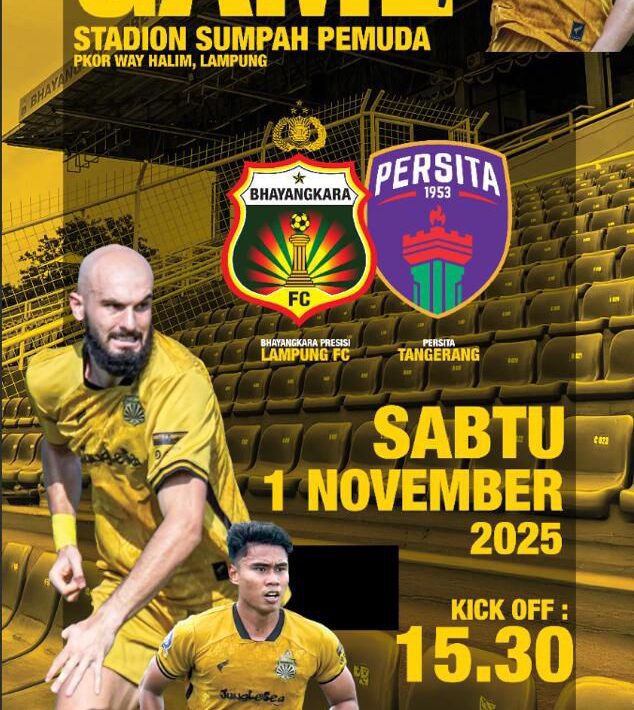 BANDAR LAMPUNG — Keseruan Liga Indonesia akan kembali hadir di Kota Tapis Berseri. Tim kebanggaan masyarakat Lampung, Bhayangkara Presisi Lampung FC, akan menjamu Persita Tangerang dalam laga seru yang digelar di Stadion PKOR Sumpah Pemuda, Bandar Lampung, pada Sabtu, 1 November 2025 pukul 15.30 WIB.