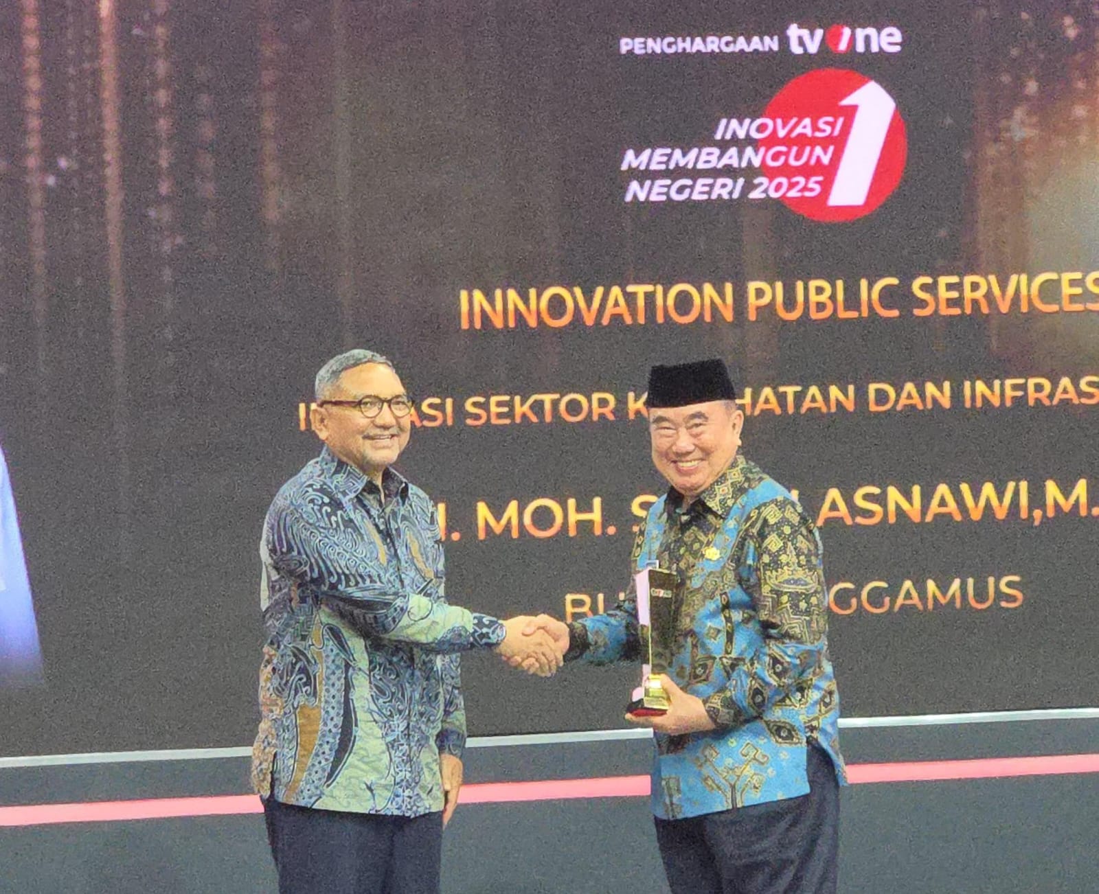 Dalam ajang bergengsi tersebut, Bupati Saleh Asnawi dianugerahi penghargaan pada kategori Inovasi Sektor Kesehatan dan Infrastruktur. Penghargaan ini menjadi bukti nyata atas dedikasi, inovasi, dan kerja keras beliau dalam meningkatkan pelayanan kesehatan serta memperkuat pembangunan infrastruktur di Kabupaten Tanggamus.