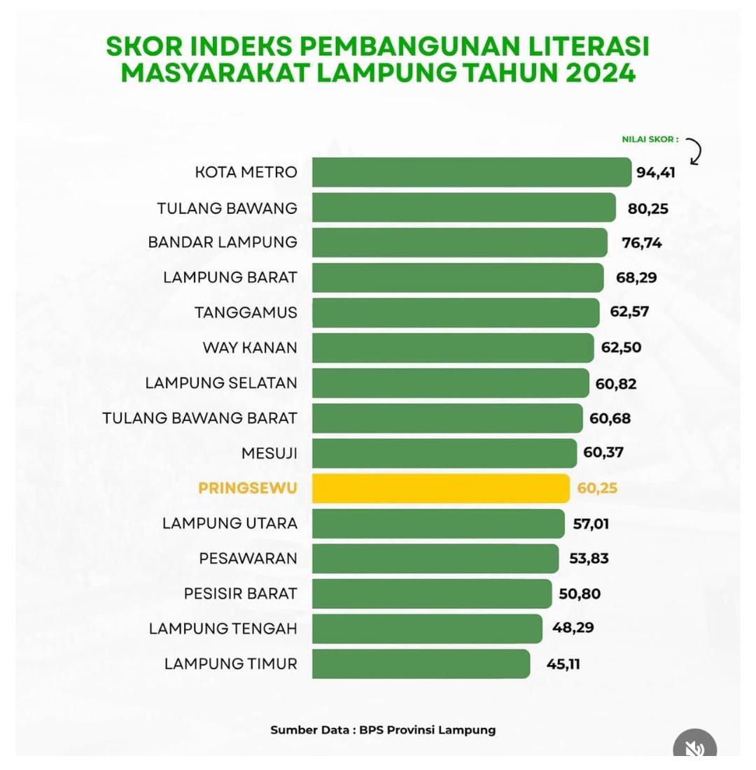 Tanggamus (Medinas_News) — Badan Pusat Statistik (BPS) Provinsi Lampung merilis Skor Indeks Pembangunan Literasi Masyarakat Lampung Tahun 2024, dan Kabupaten Tanggamus berhasil mencatatkan capaian gemilang. Dalam laporan tersebut, Tanggamus menembus 5 besar dengan skor 62,57, menempati peringkat kelima di antara 15 kabupaten/kota se-Lampung.