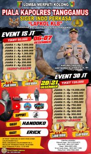 Tanggamus (Medinas_News) — Gelaran Piala Kapolres Tanggamus 2025 kembali menjadi pusat perhatian para pecinta merpati kolong se-Lampung dan sekitarnya. Dimulai dengan Event Tabanas 15 Juta pada tanggal 6–7 Desember 2025, suasana lapangan Kalibening, Kecamatan Talang Padang, benar-benar pecah oleh sorak, strategi, dan persaingan sengit para pemain top.