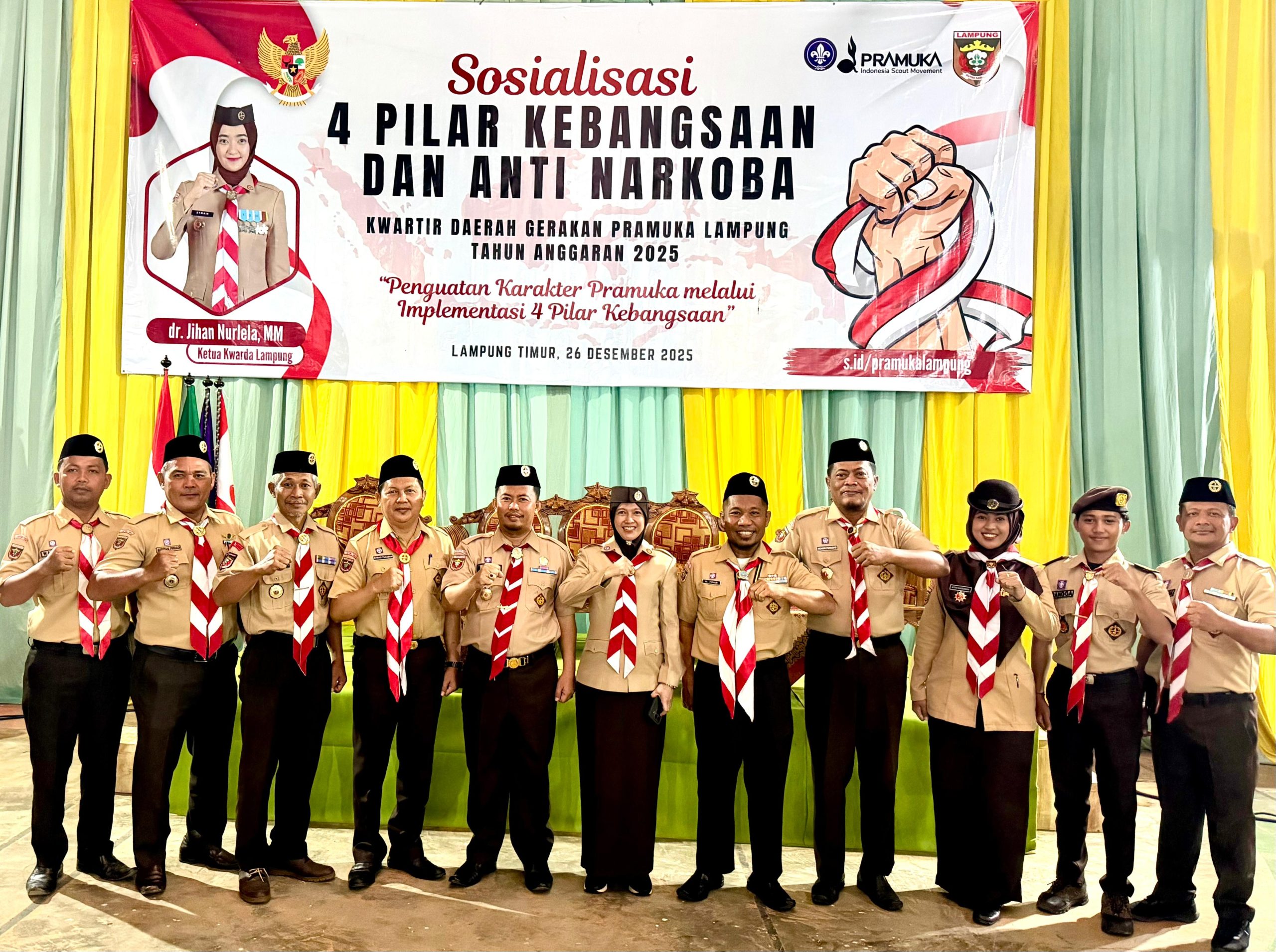 Lampung Timur (MDSnews) — Kwartir Daerah (Kwarda) Gerakan Pramuka Lampung menggelar kegiatan Sosialisasi Empat Pilar Kebangsaan dan Anti Narkoba pada Jumat (26/12/2025) pagi. Kegiatan tersebut berlangsung di Aula SMK Ma’arif NU 1 Purbolinggo, Kabupaten Lampung Timur.