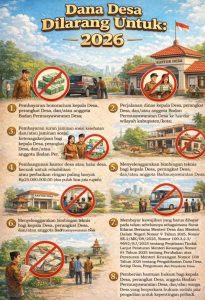 Dalam infografis yang beredar, terdapat sejumlah larangan tegas penggunaan Dana Desa tahun 2026. Dana Desa tidak boleh digunakan untuk pembayaran honorarium kepala desa, perangkat desa, maupun anggota Badan Permusyawaratan Desa (BPD). Selain itu, anggaran juga dilarang dipakai untuk perjalanan dinas ke luar wilayah kabupaten/kota, termasuk kegiatan bimbingan teknis (bimtek) bagi aparatur desa dan BPD.