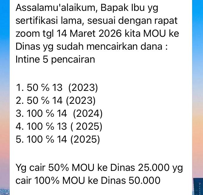 Selain itu, Dalam tangkapan layar tersebut juga disebutkan bahwa pungutan itu dikaitkan dengan kesepakatan tiga pihak, yakni Kelompok Kerja Guru (KKG) PAI, Musyawarah Guru Mata Pelajaran (MGMP) SMP, dan Dinas Pendidikan. Kesepakatan tersebut disebut sebagai tindak lanjut rapat virtual pada 14 Maret 2026.